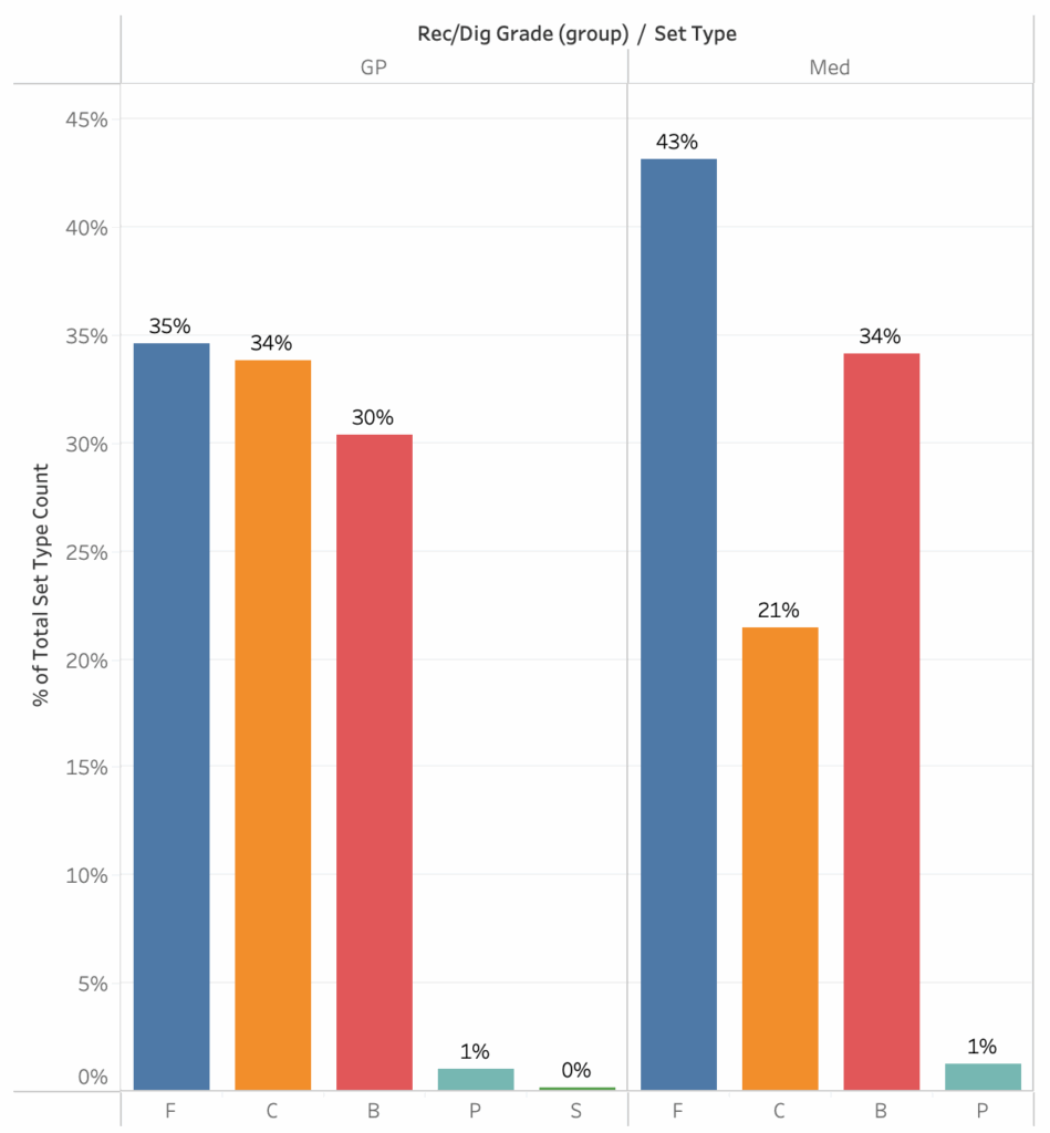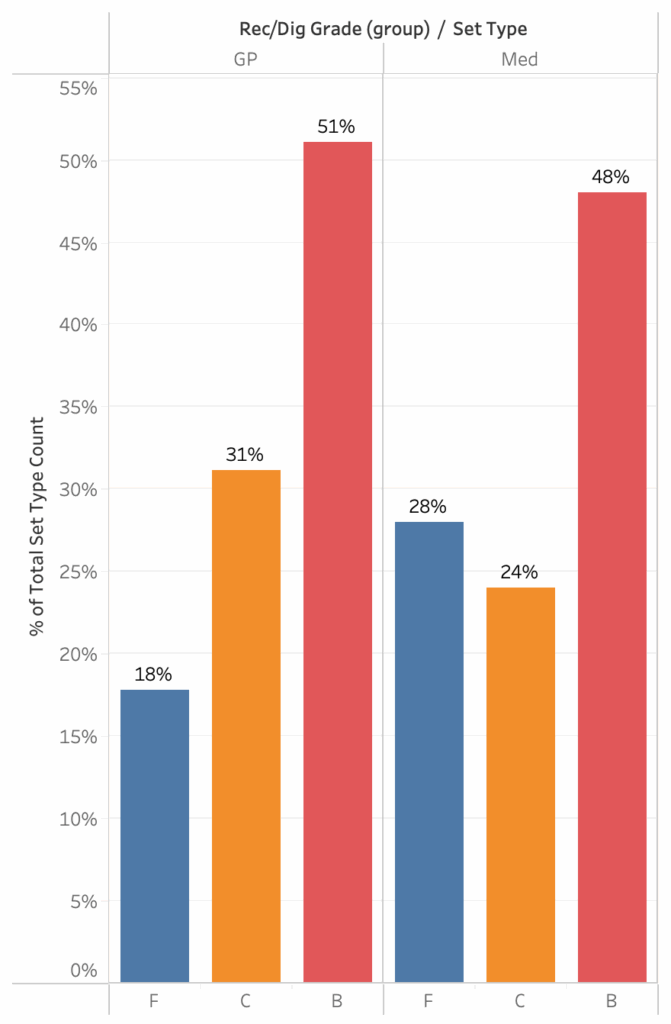 In the semifinals and finals, setters distribute the ball fairly evenly between outside hitters (F), middles (C), and opposites (B) when things are easy. When things get a little harder, they set middles a lot less, set outsides a lot more, and set opposites a little more. That makes a lot of intuitive sense as fans watch games. That becomes a baseline and comparisons can be made between that baseline and specific teams.