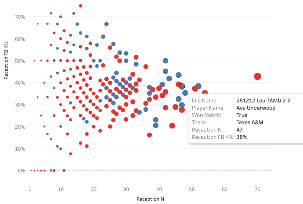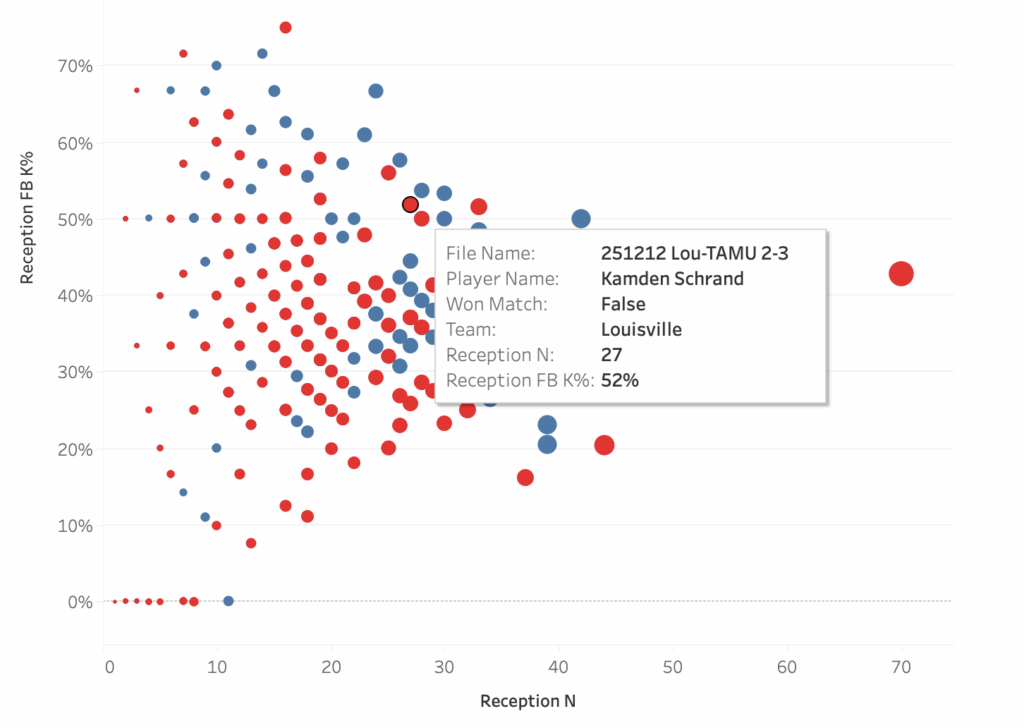 These two plots show the same data, the only difference is which data point is highlighted. The plots show how well a team attacked in a match when a particular player passed compared to how often that player passed, so each dot is a single player in a single match. The two highlighted players are liberos, Ava Underwood of Texas A&M and Kamden Schrand of Louisville, and the boxes show their performances in their match against each other. Louisville served at Underwood 47 times in the match and Texas A&M earned a first ball kill 38% of the time when she passed. Contrast that with how A&M served at Schrand: she passed only 27 serves, probably because her team earned a first ball kill on 52% of her passes.