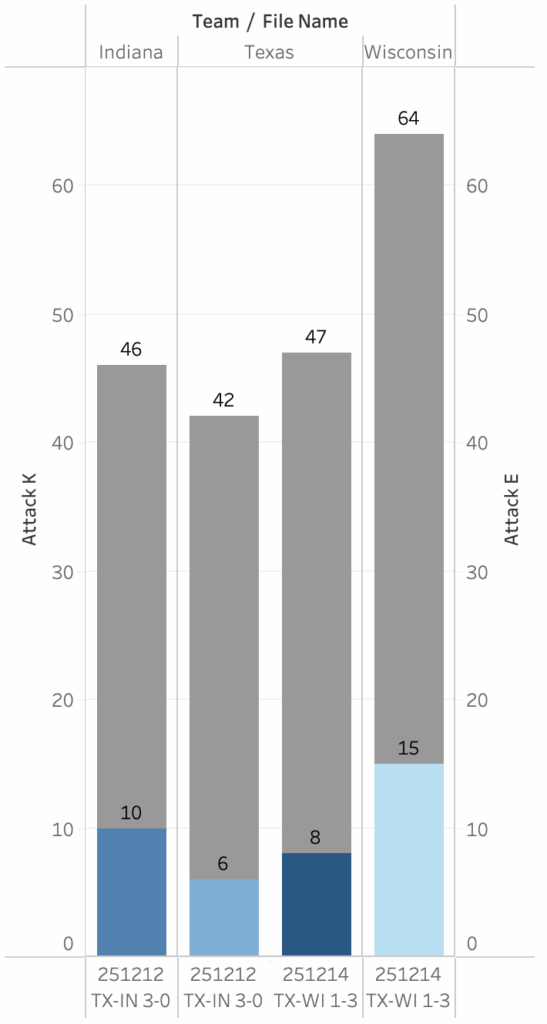 In the 2025 NCAA regional semifinals and finals, Texas first beat Indiana and then lost to Wisconsin. In the graph above, the two leftmost bars show Indiana’s kills and attack errors as well as Texas’. The two rightmost bars show the same information for Texas, followed by Wisconsin. In the match against Indiana, Texas made fewer unforced attack errors than Indiana but also earned fewer points than they did. Indiana had more of each, but in equal amounts, so both teams were equal in points won and lost via attacking. This means the match was decided by other factors. In this match, Texas had 12 blocks while Indiana had 3. Two nights later, Texas committed nearly the same number of unforced errors and had slightly more kills against Wisconsin than against Indiana. While Wisconsin committed quite a few unforced attack errors, they more than made up for that by having more kills than Texas by a wide margin. Being able to see how and how much teams are earning points is a powerful part of telling stories about how and why teams win.