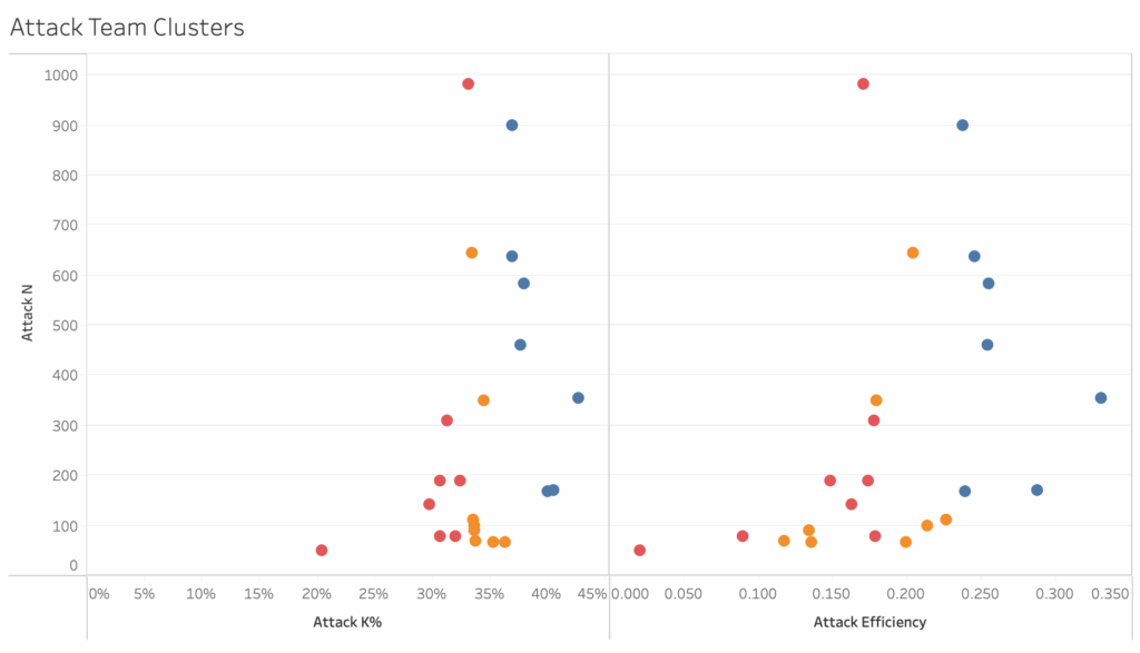 The data in the plots above show team kill percentage and attack efficiency, with teams clustered into thirds. You can see that the distribution of the teams is roughly the same in both plots. That means changing from attack efficiency to kill percentage doesn’t take any explaining. The benefit is that kill percentage has a much clearer connection to winning points, winning sets, and winning matches. When a team has a higher kill percentage than their opponents, they almost always win. Kill percentage helps fans understand what is likely to happen when a team attacks. Teams that earn kills 50% of the time will score about half the time they attack. It’s much harder to figure out how often a team that hits .250 scores, but it isn’t 25% of the time.