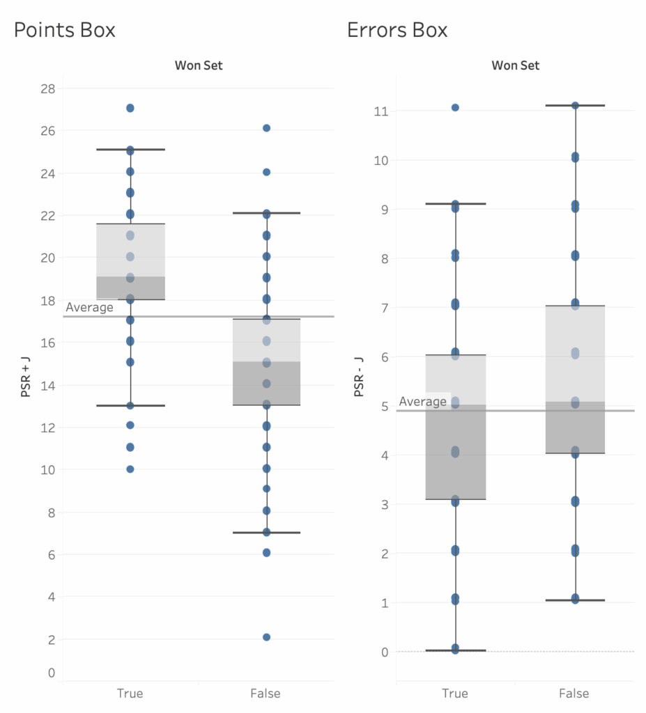 Set-level data is a powerful tool that helps explain how match-level data comes to be. The box plots above represent average players’ performances but each blue dot shows a measure of single-set performance. The sum of the blue dots yields the average, which can look very different than what happens in a single set. Having the comparison between set-level data and match-level data makes it possible to tell much more nuanced stories about performance.