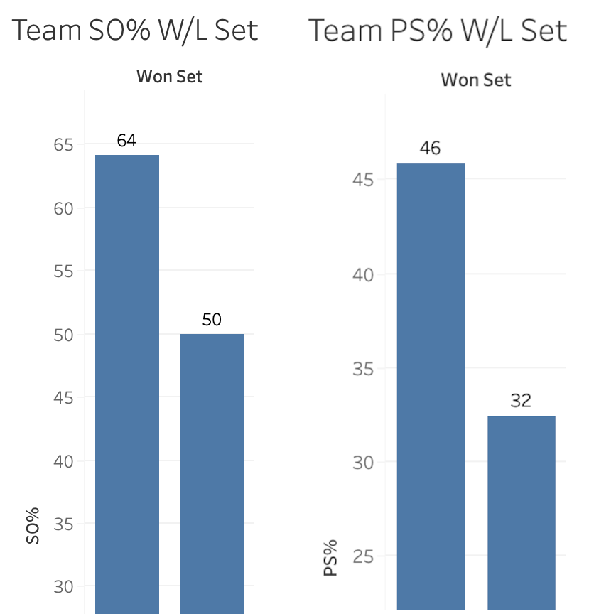 Team scoring data is another building block that helps people understand how the race to 25 progresses. This data has been made more available by NCAA teams in recent years but, because it is still not universal, it is rarely used by fans and broadcasters to explain how matches unfold. But side out percentage and point scoring percentage are simple, powerful pieces of data that can help tell stories about who’s winning, who’s losing, and why.